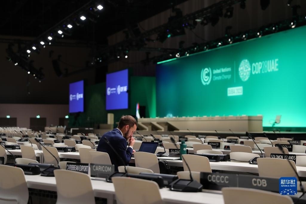12月12日,在阿聯(lián)酋迪拜,參會人員在聯(lián)合國氣候變化迪拜大會會場內(nèi)工作。新華社記者 王東震 攝