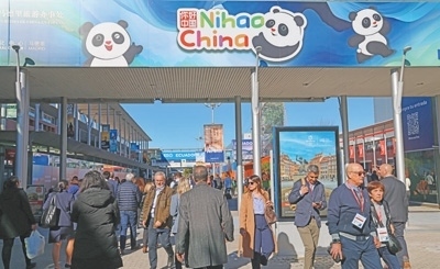 會展中心外側(cè)主通道的顯著位置,印有“你好!中國”國家旅游形象圖案的廣告牌。 本報(bào)記者 許海林?jǐn)z