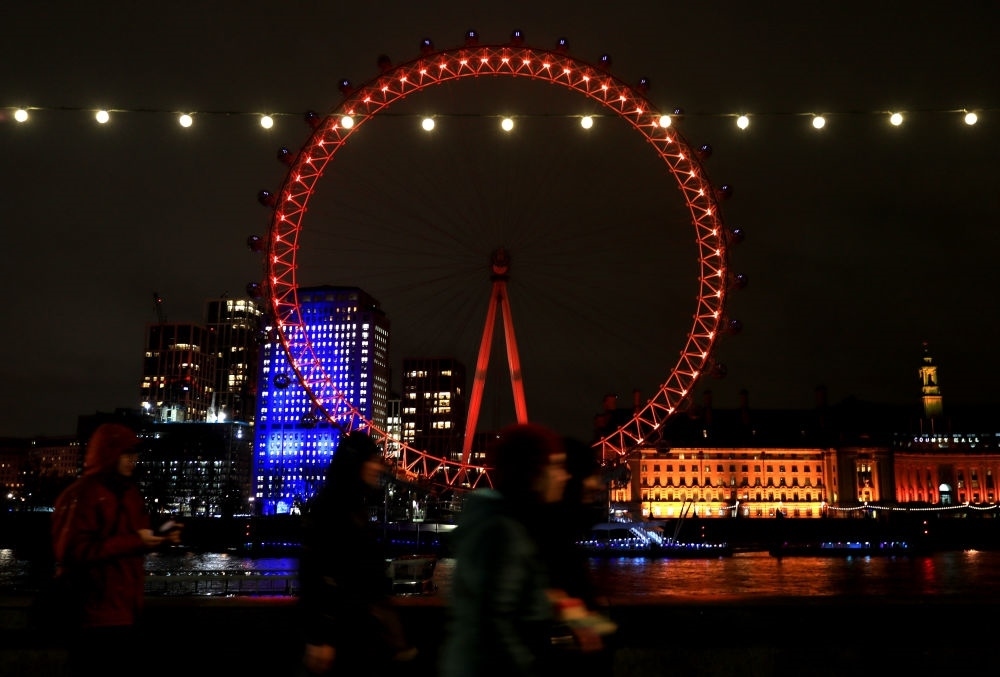 2月8日,在英國倫敦,行人走過亮起紅色燈光的“倫敦眼”。新華社記者 李穎 攝