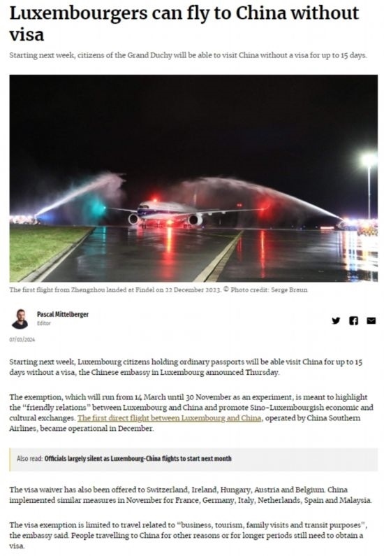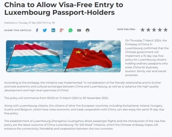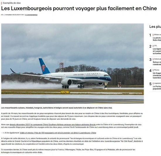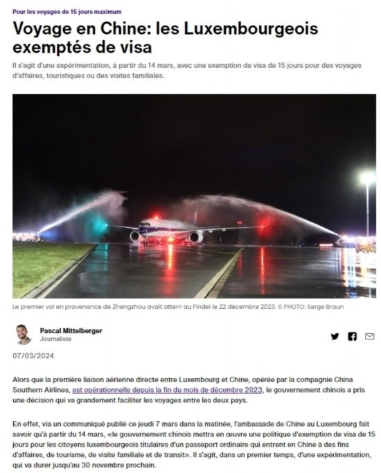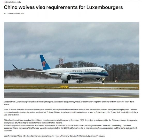 近日,中國政府決定自2024年3月14日0時(shí)起至2024年11月30日24時(shí),對(duì)包括盧森堡在內(nèi)的6國持普通護(hù)照人員實(shí)行部分免簽。中國駐盧使館及時(shí)向盧外交部等部門和主流媒體作了通報(bào),盧政府和媒體對(duì)中方免簽政策予以高度評(píng)價(jià)。