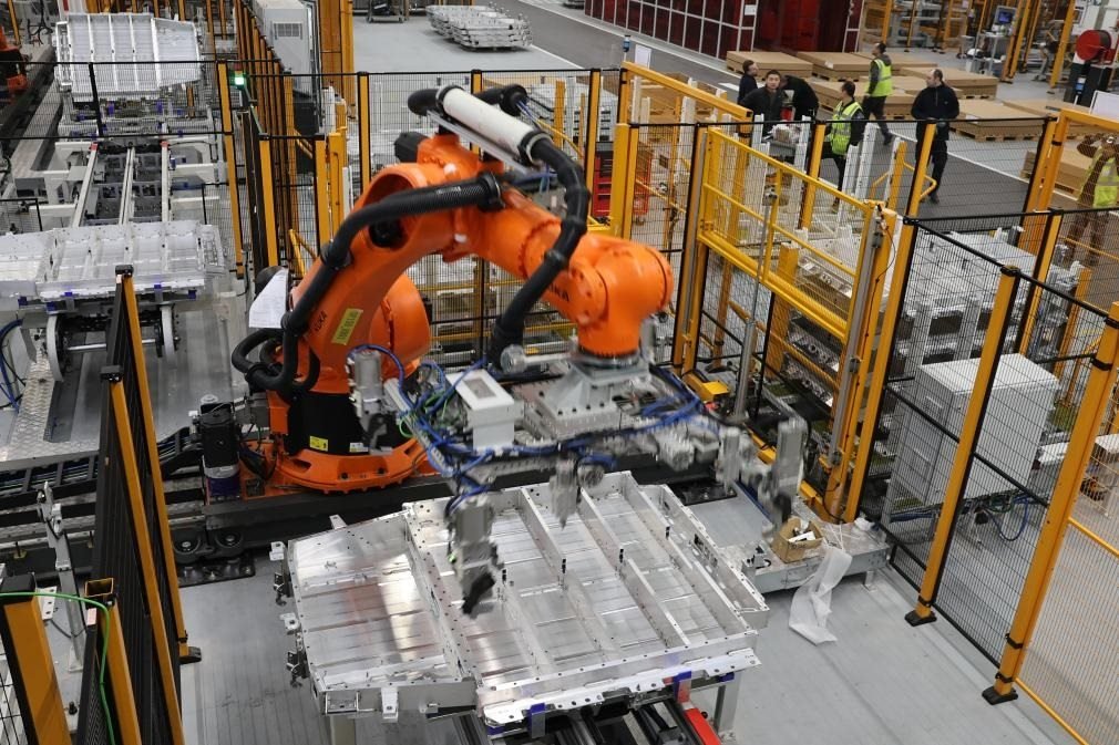 2月23日,在法國(guó)呂茨,搬運(yùn)機(jī)器人在中國(guó)敏實(shí)集團(tuán)與法國(guó)雷諾集團(tuán)成立的合資公司的電池盒產(chǎn)線上工作。新華社記者張百慧攝