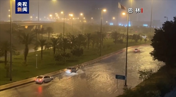 15日,暴雨、閃電和大風(fēng)天氣襲擊巴林首都麥納麥,道路被洪水淹沒(méi),車(chē)輛在沒(méi)過(guò)半個(gè)輪胎高的洪水中行駛。