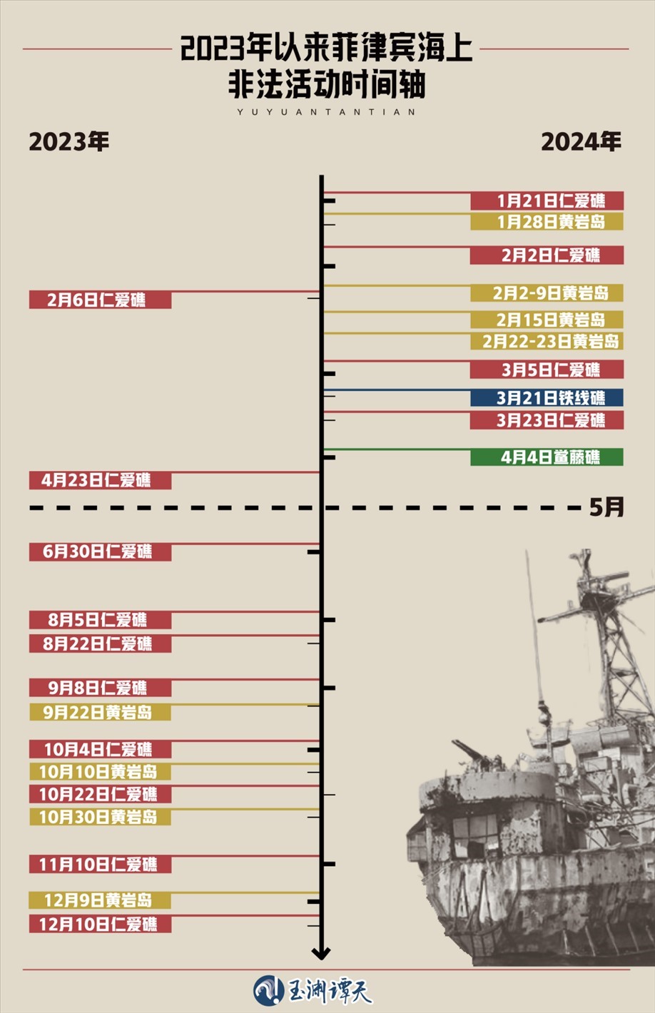 這是2023年以來,菲律賓在南海挑釁滋事的時(shí)間線,可以看到,在防務(wù)準(zhǔn)則更新后,菲律賓在南海挑釁滋事的頻次驟增。