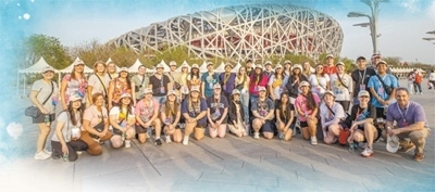 在北京國家體育場外,馬斯卡廷中學師生合影留念。
