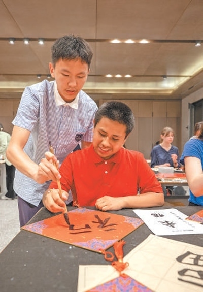 馬斯卡廷中學學生(前)在體驗漢字書法。