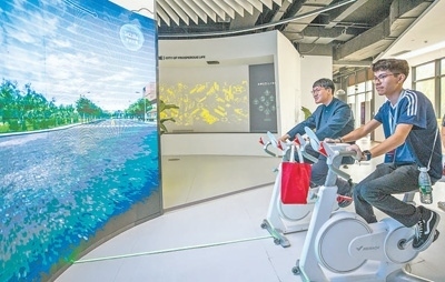 馬斯卡廷中學學生(右)體驗VR單車雄安新區(qū)城市漫游項目。