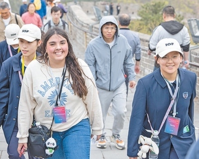 馬斯卡廷中學學生(前左)登上北京八達嶺長城。