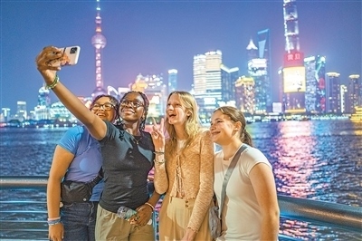 在上海外灘,馬斯卡廷中學學生拍照留念。王 初攝(人民視覺)