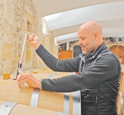 法國大酒窖集團波爾多分公司首席釀酒師和技術(shù)總監(jiān)文森·卡紹在酒窖取酒品嘗。本報記者 邢 雪攝