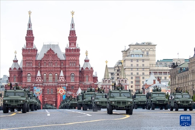 5月9日,在俄羅斯首都莫斯科,軍車編隊駛過紅場。新華社記者 曹陽 攝