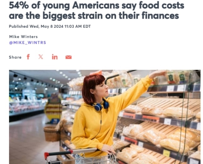 中國日報網(wǎng)5月10日電 ?當(dāng)?shù)貢r間5月8日,美國財經(jīng)網(wǎng)站CNBC報道,一項調(diào)查顯示,年輕的美國人正在感受通貨膨脹帶來的壓力,54%的受訪者表示食品價格上升對他們的打擊最大。
