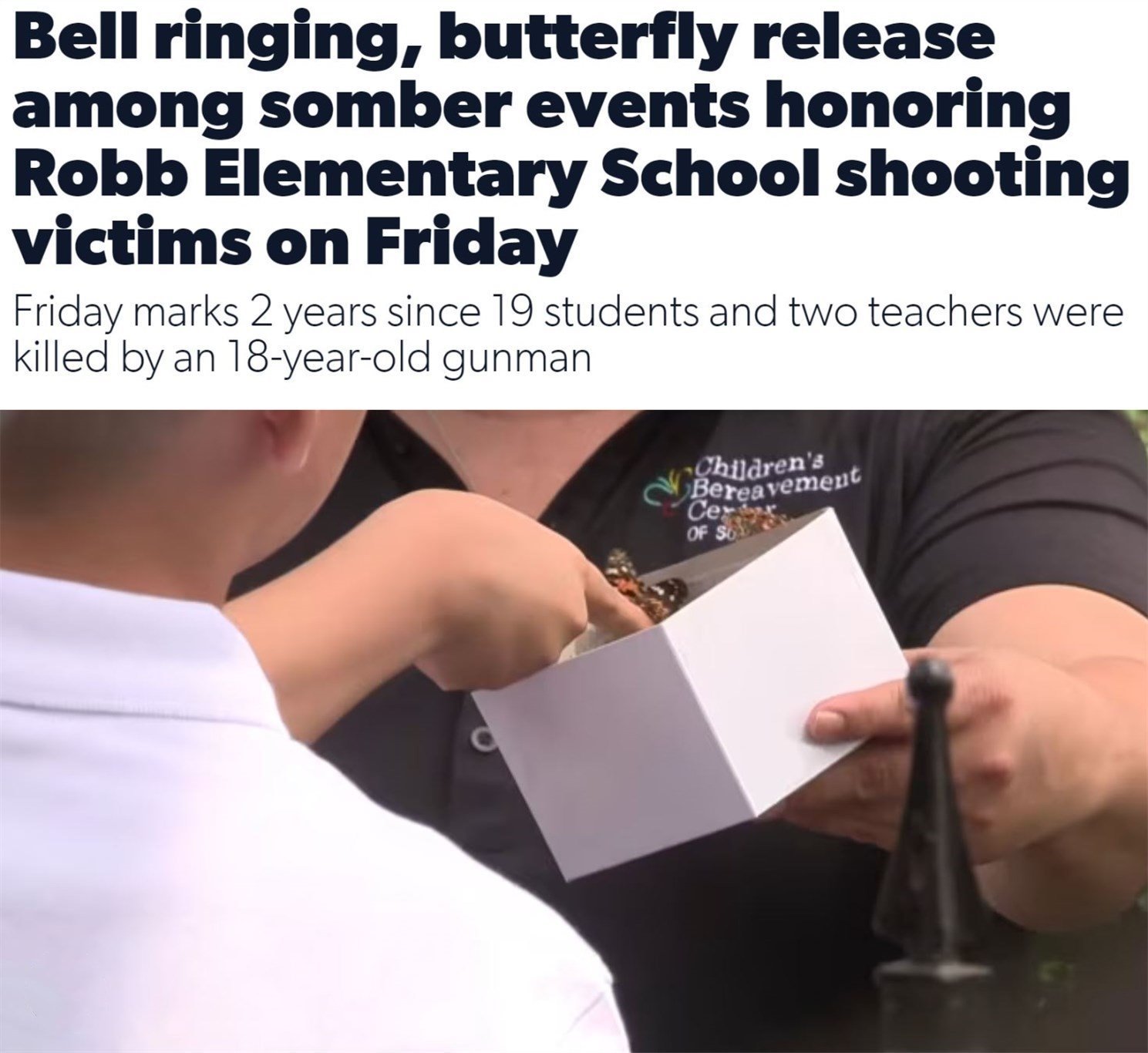 △美國(guó)廣播公司旗下KSAT網(wǎng)站:當(dāng)?shù)孛癖?4日通過放飛蝴蝶的方式悼念遇難師生