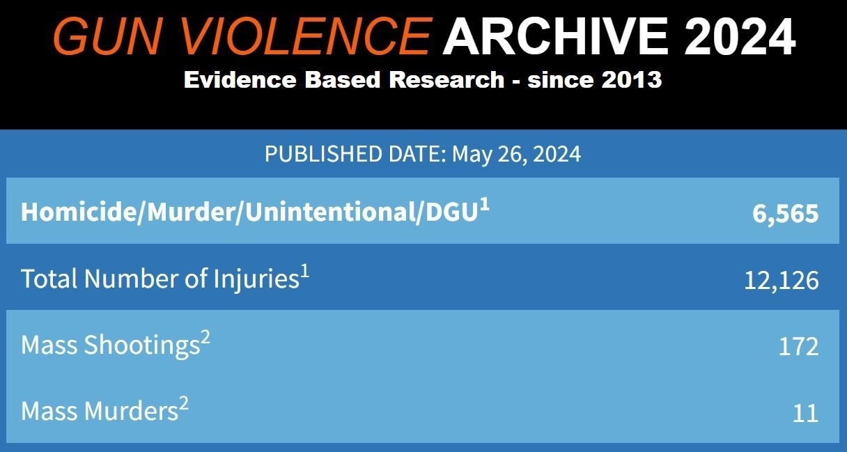 美國(guó)“槍支暴力檔案”網(wǎng)站截至5月26日的最新數(shù)據(jù)顯示,全美今年以來(lái)已經(jīng)發(fā)生172起大規(guī)模槍擊事件,槍支暴力已造成6565人死亡。