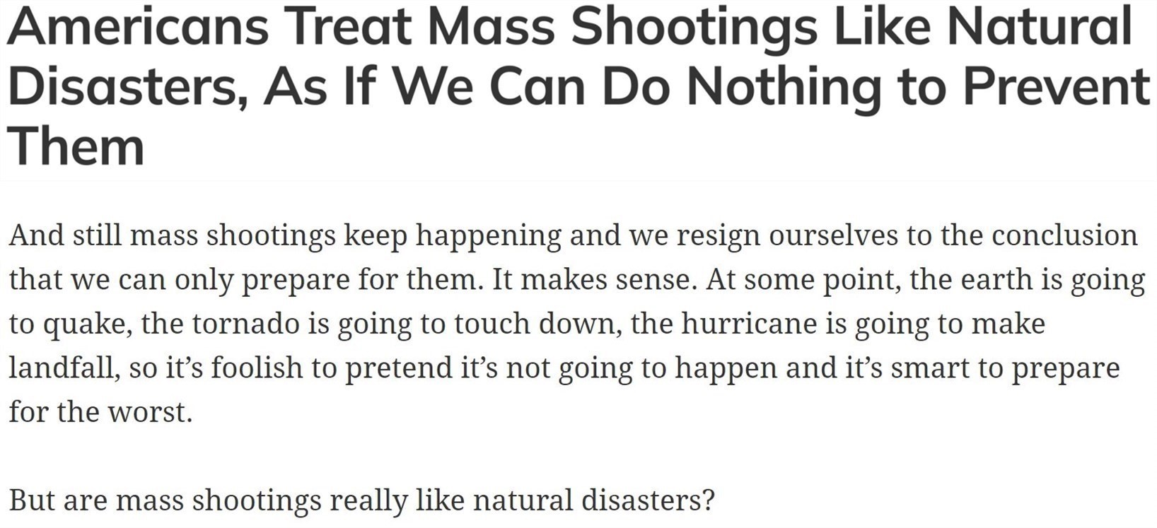 有美媒稱,對(duì)于一起又一起槍擊事件,如今的美國(guó)只是進(jìn)行數(shù)字的統(tǒng)計(jì),卻無(wú)力采取行動(dòng)改變現(xiàn)狀,似乎在美國(guó)人眼里,槍支暴力已經(jīng)成為像洪水、颶風(fēng)、野火一樣的“天災(zāi)”,而不是可以預(yù)防的人禍。