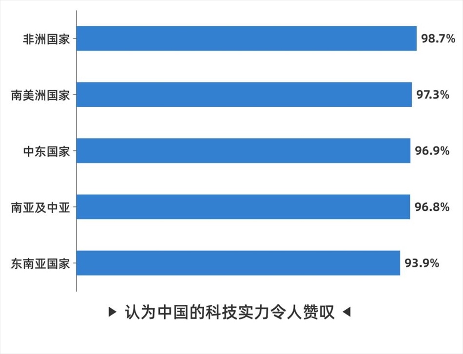 在科技表現(xiàn)方面,中國的科技實力同樣受到全球受訪者認可。其中,92.3%的受訪者認為中國的科技實力令人贊嘆,排名前五位的分別是非洲國家受訪者(98.7%)、南美洲國家受訪者(97.3%)、中東國家受訪者(96.9%)、南亞及中亞國家受訪者(96.8%)以及東南亞國家受訪者(93.9%)。