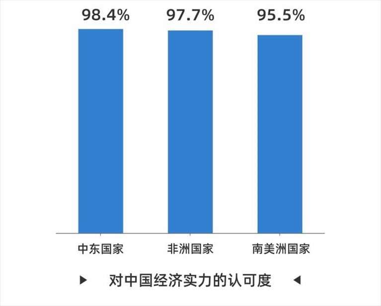 在經(jīng)濟表現(xiàn)方面,92.3%的受訪者稱贊中國經(jīng)濟實力強勁,這一調(diào)查結(jié)果與去年基本持平。其中,中東國家受訪者的認可度達到98.4%,非洲國家和南美洲國家受訪者的認同度分別為97.7%和95.5%。