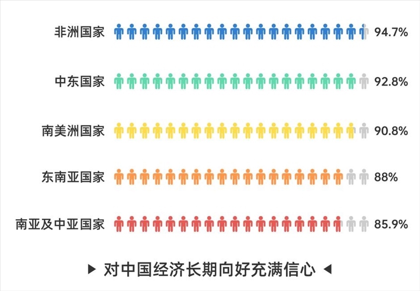 另有89.2%的受訪者肯定中國經(jīng)濟對世界經(jīng)濟的卓越貢獻,較去年上升9.7個百分點,非洲國家、中東國家和南美洲國家受訪者的認同度分別為96.3%、95.2%和93.9%。