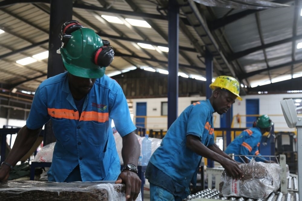 2024年6月10日,在科特迪瓦南部城鎮(zhèn)達(dá)布郊區(qū),工人們在美蘭橡膠加工廠對成品橡膠進(jìn)行打包。中國加工廠幫助科特迪瓦橡膠增加產(chǎn)品附加值,提高膠農(nóng)收入。