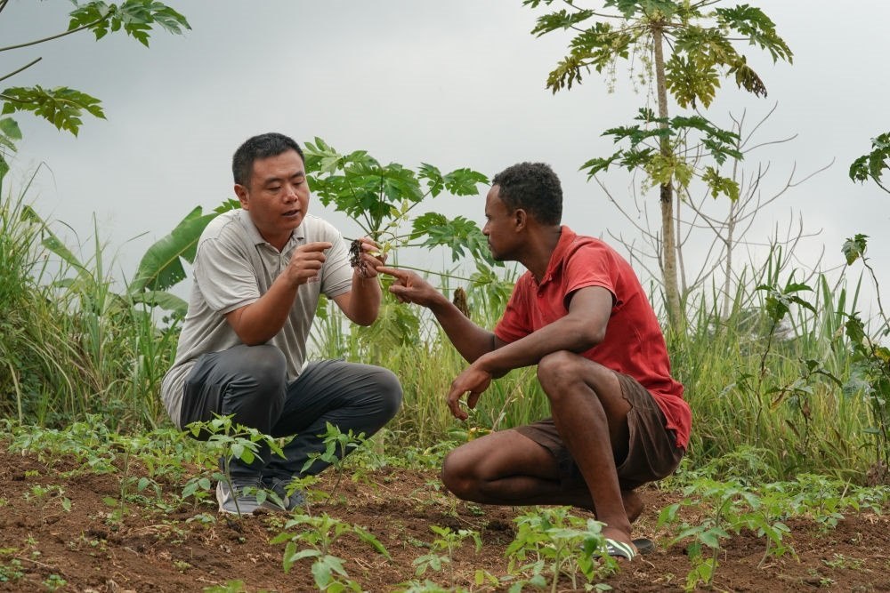 2023年7月15日,在圣多美和普林西比洛巴塔縣卡德拉斯村,中國援圣普農(nóng)牧業(yè)技術(shù)專家組專家許州達(dá)在田間指導(dǎo)農(nóng)戶努內(nèi)斯種植辣椒。中國援圣普農(nóng)牧業(yè)技術(shù)專家組與圣普農(nóng)業(yè)、漁業(yè)和農(nóng)村發(fā)展部合作,于2021年在圣普洛巴塔縣卡德拉斯村建立第一個(gè)中圣普農(nóng)業(yè)減貧示范村,并有效結(jié)合中國農(nóng)業(yè)技術(shù)和扶貧經(jīng)驗(yàn)幫助當(dāng)?shù)剞r(nóng)民增產(chǎn)增收。