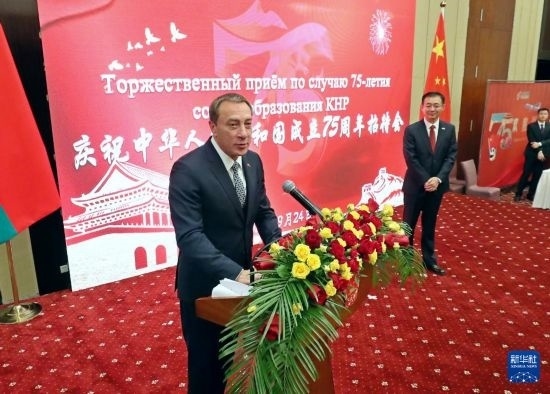 9月24日,白俄羅斯第一副總理尼古拉·斯諾普科夫在明斯克舉行的慶祝中華人民共和國成立75周年招待會(huì)上致辭。新華社發(fā)(任科夫攝)