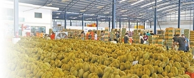 在位于泰國(guó)尖竹汶府的優(yōu)果東明水果廠,經(jīng)過分揀和清潔處理的榴蓮按品級(jí)分類整齊堆放、等待裝箱。本報(bào)記者 白元琪攝