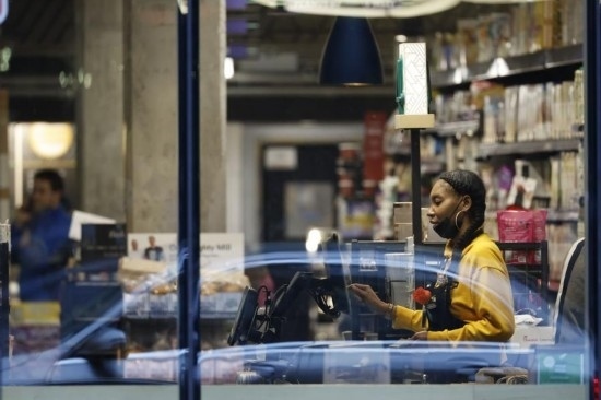 2022年5月6日,在美國華盛頓,一家超市的員工在收銀臺旁工作。新華社發(fā)(沈霆攝)