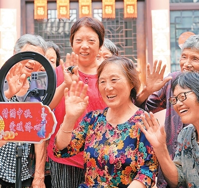 江蘇省海安市墩頭鎮(zhèn)寶祥村僑眷與海外親人視頻連線。