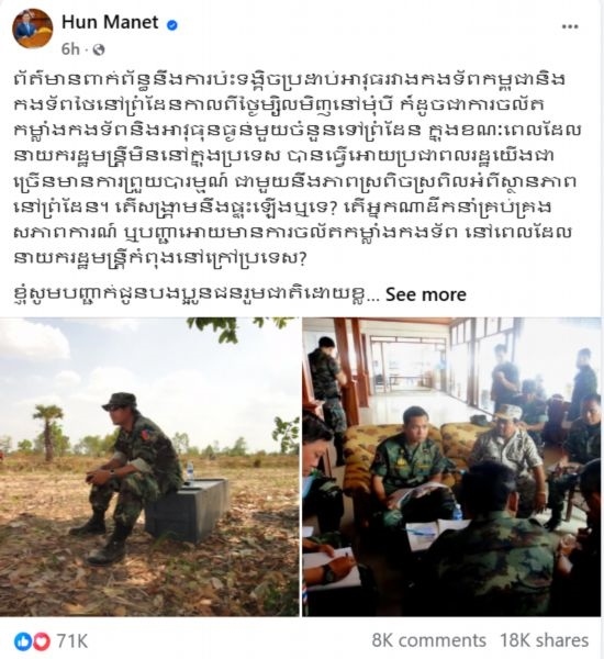 洪瑪奈在社交媒體上發(fā)文說(shuō),“我希望柬泰兩國(guó)陸軍高層今天的會(huì)談能夠取得積極成果,一如既往地保持雙方前線部隊(duì)間的和平與良好溝通”。