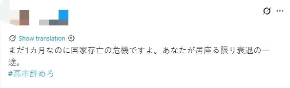 此外,高市在個(gè)人社交媒體上的相關(guān)言論同樣引發(fā)巨大爭(zhēng)議。她近期發(fā)布的帖文在日本網(wǎng)民中激起強(qiáng)烈反響,評(píng)論區(qū)滿是對(duì)其錯(cuò)誤言論的不滿和譴責(zé),不少民眾要求其撤回涉臺(tái)不當(dāng)言論、向中國(guó)道歉,并辭去首相職務(wù)。