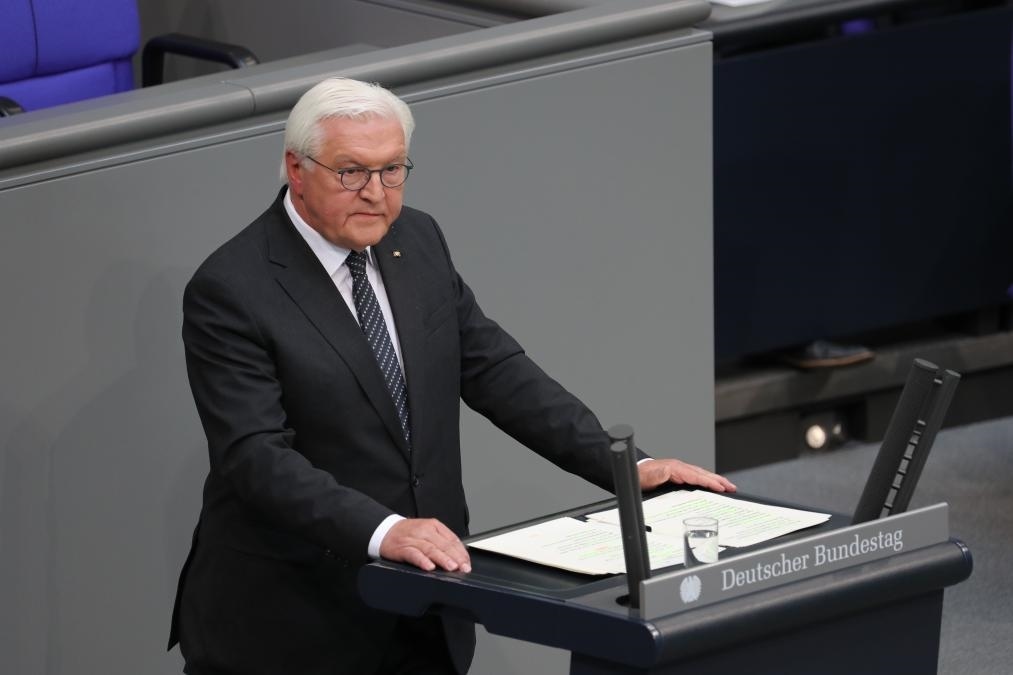 5月8日,德國(guó)總統(tǒng)施泰因邁爾在首都柏林國(guó)會(huì)大廈舉行的紀(jì)念活動(dòng)上致辭。新華社記者杜哲宇攝