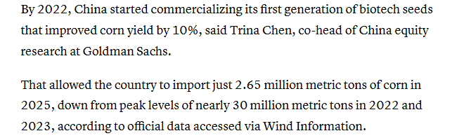 報道還稱,中國在農(nóng)業(yè)研究與開發(fā)方面投入巨大,2019年至2021年其公共部門在這方面的支出大約是美國的兩倍。報道援引高盛中國股票研究部聯(lián)席主管的觀點稱,到2022年,中國已開始將第一代生物育種產(chǎn)業(yè)化應用,這些種子使玉米產(chǎn)量提高了10%。報道還援引萬得資訊獲得的官方數(shù)據(jù)稱,這使得中國在2025年的玉米進口量僅為265萬噸,遠低于2022年和2023年近3000萬噸的峰值水平。