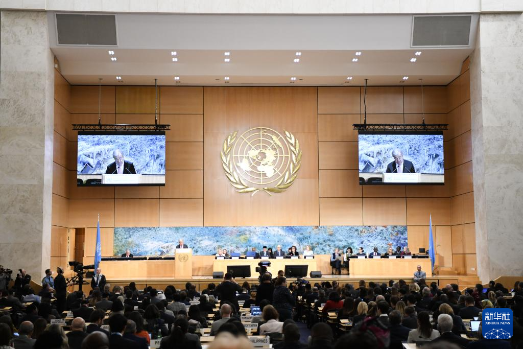 2月23日,在瑞士日內(nèi)瓦萬國宮,聯(lián)合國秘書長古特雷斯在聯(lián)合國人權(quán)理事會第61屆會議上講話。 新華社記者 連漪 攝