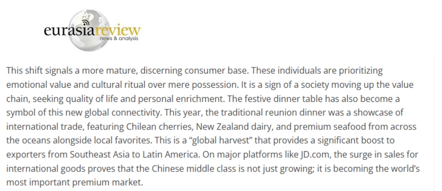 文章稱,這種轉變標志著中國消費者變得更加成熟、更具品位。他們更注重情緒價值和文化儀式感,而不僅僅是物質追求。這象征著社會正朝著價值鏈上游邁進,追求生活品質和個人提升。節(jié)日的餐桌也已成為這種新型全球互聯(lián)的象征。今年,傳統(tǒng)年夜飯成為國際貿(mào)易的展示窗口:既有智利車厘子、新西蘭乳制品和來自大洋彼岸的優(yōu)質海鮮,也有本地美食。這是一場“全球豐收”,為從東南亞到拉丁美洲的商品出口提供了強大動力。在跨境電商平臺上,國際商品的銷售激增證明了中國正在成為全球最重要的高端消費市場。