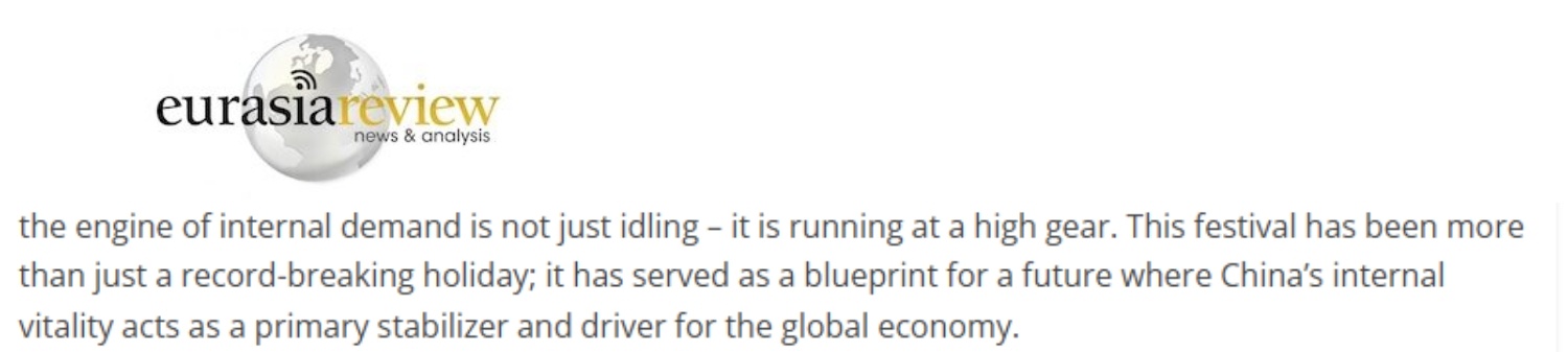 文章最后說,春節(jié)消費熱潮表明,內(nèi)需引擎非但沒有空轉,反而在高速運轉。這個春節(jié)的意義不僅僅在于其破紀錄的假期數(shù)據(jù),而是在于它繪制了一幅未來藍圖:中國的內(nèi)在活力將成為全球經(jīng)濟的主要穩(wěn)定器和驅動力。