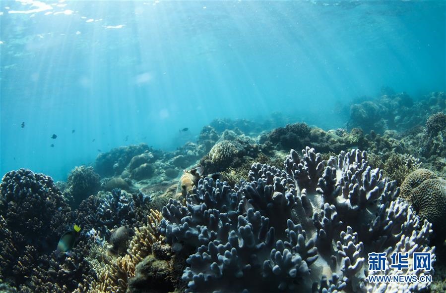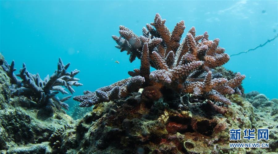 這是海南三亞蜈支洲島海域海洋牧場(chǎng)內(nèi)生長(zhǎng)的珊瑚(4月28日攝)。新華社記者楊冠宇攝