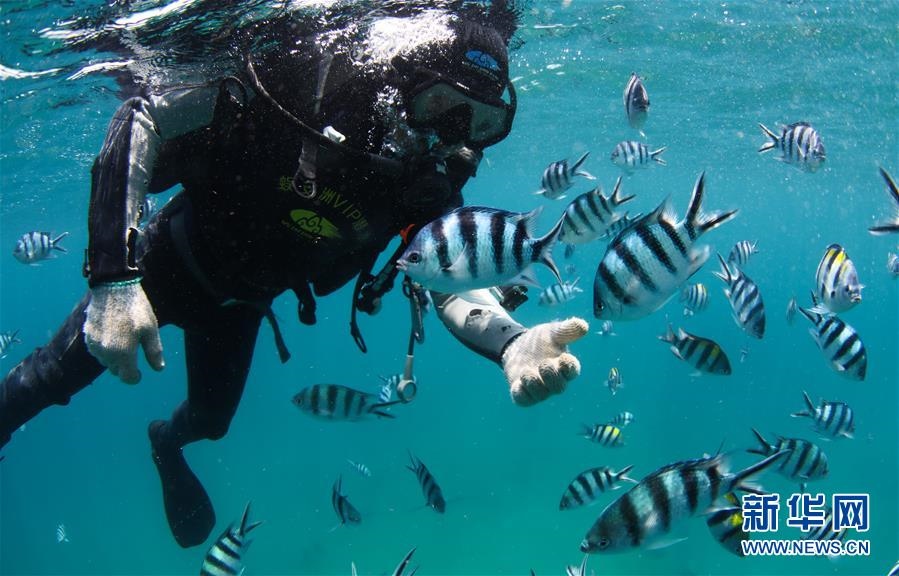 在海南三亞蜈支洲島海域拍攝的與海葵共生的小丑魚(5月28日攝)。海南省三亞蜈支洲島海域海洋牧場(chǎng)是海南首個(gè)國家級(jí)海洋牧場(chǎng)示范區(qū),也是中國第一個(gè)位于熱帶地區(qū)的海洋牧場(chǎng)。近年來,蜈支洲島海域海洋牧場(chǎng)推進(jìn)海洋生態(tài)系統(tǒng)的恢復(fù)和保護(hù),先后開展了人工魚礁投放、海洋環(huán)境修復(fù)、珊瑚移植等工作。截至2019年底,蜈支洲島海域海洋牧場(chǎng)共投放各類人工魚礁1526塊、船礁21艘和一批火山石礁,共達(dá)4萬空立方米,礁區(qū)海域的漁業(yè)資源比非礁區(qū)要高5倍以上。目前,蜈支洲島海域海洋牧場(chǎng)已初現(xiàn)雛形。新華社記者楊冠宇攝