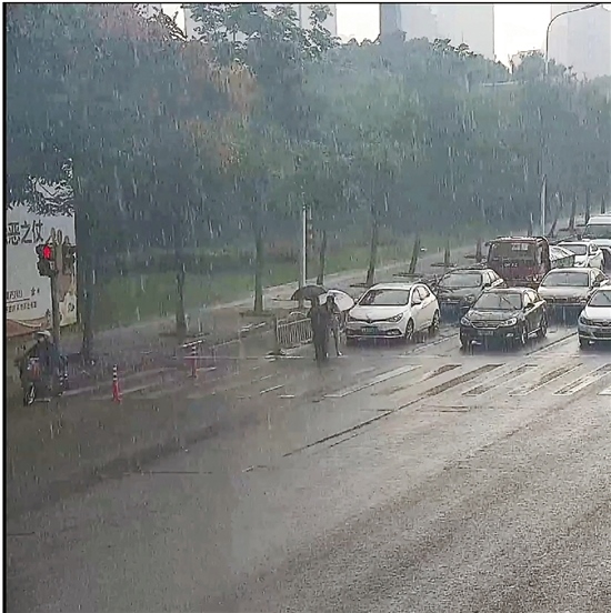 當(dāng)老人好不容易快走到馬路對(duì)面時(shí),天公不作美,突然下起瓢潑大雨,又一幕感人的瞬間出現(xiàn)了:一輛等候通行的小轎車上下來一名女司機(jī),從后備廂拿出一把雨傘后,快步跑上前,遞到老人手里。