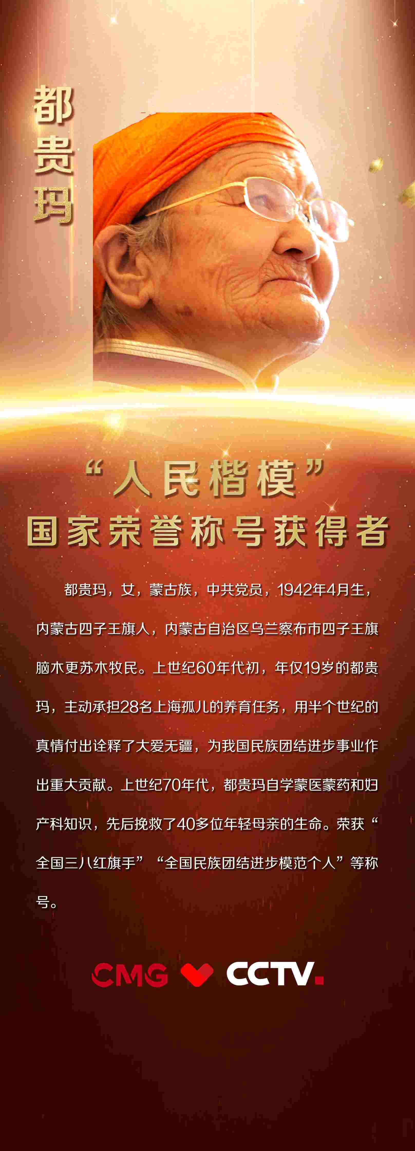 都貴瑪,女,蒙古族,中共黨員,1942年4月生,內(nèi)蒙古四子王旗人,內(nèi)蒙古自治區(qū)烏蘭察布市四子王旗腦木更蘇木牧民。上世紀60年代初,年僅19歲的都貴瑪,主動承擔28名上海孤兒的養(yǎng)育任務,用半個世紀的真情付出詮釋了大愛無疆,為我國民族團結(jié)進步事業(yè)作出重大貢獻。上世紀70年代,都貴瑪自學蒙醫(yī)蒙藥和婦產(chǎn)科知識,先后挽救了40多位年輕母親的生命。榮獲“全國三八紅旗手”“全國民族團結(jié)進步模范個人”等稱號。