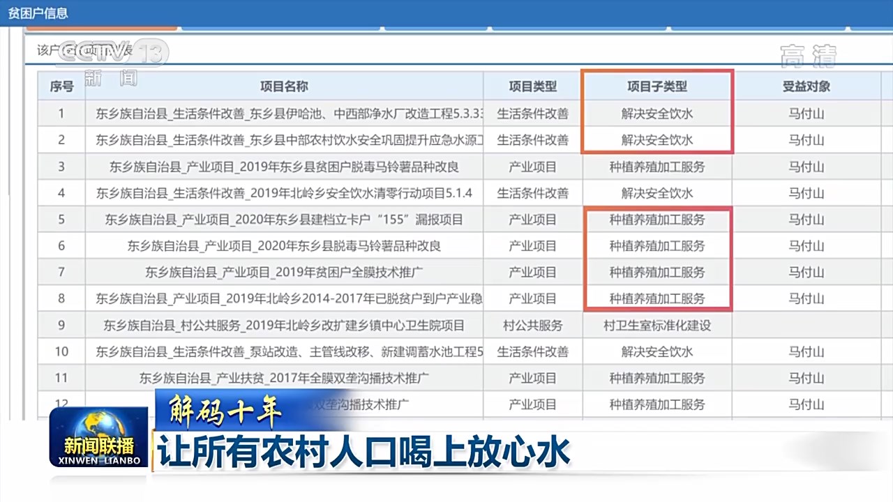 水能解渴,更能致富。在全國(guó)扶貧開(kāi)發(fā)信息系統(tǒng)中,我們找到了過(guò)去十年中“因水致貧”的家庭。當(dāng)我們查詢這些貧困戶的脫貧措施和鞏固提升措施,可以看到“解決安全飲水”和“特色種植、養(yǎng)殖產(chǎn)業(yè)”總會(huì)同時(shí)出現(xiàn)。