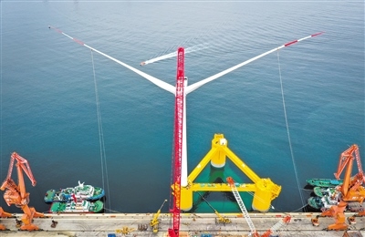 由中國船舶集團(tuán)海裝風(fēng)電股份有限公司牽頭,聯(lián)合相關(guān)單位自主研制的“扶搖號”浮式風(fēng)電機(jī)組浮體平臺上配備6.2兆瓦抗臺型I類風(fēng)力發(fā)電機(jī)組,在深遠(yuǎn)海應(yīng)用場將依靠九個對稱分布的懸錨鏈系泊實(shí)現(xiàn)固定。圖為完成總裝的國內(nèi)首臺深遠(yuǎn)海浮式風(fēng)電裝備“扶搖號”在茂名廣港碼頭靜待拖航(無人機(jī)照片)。記者劉大偉攝