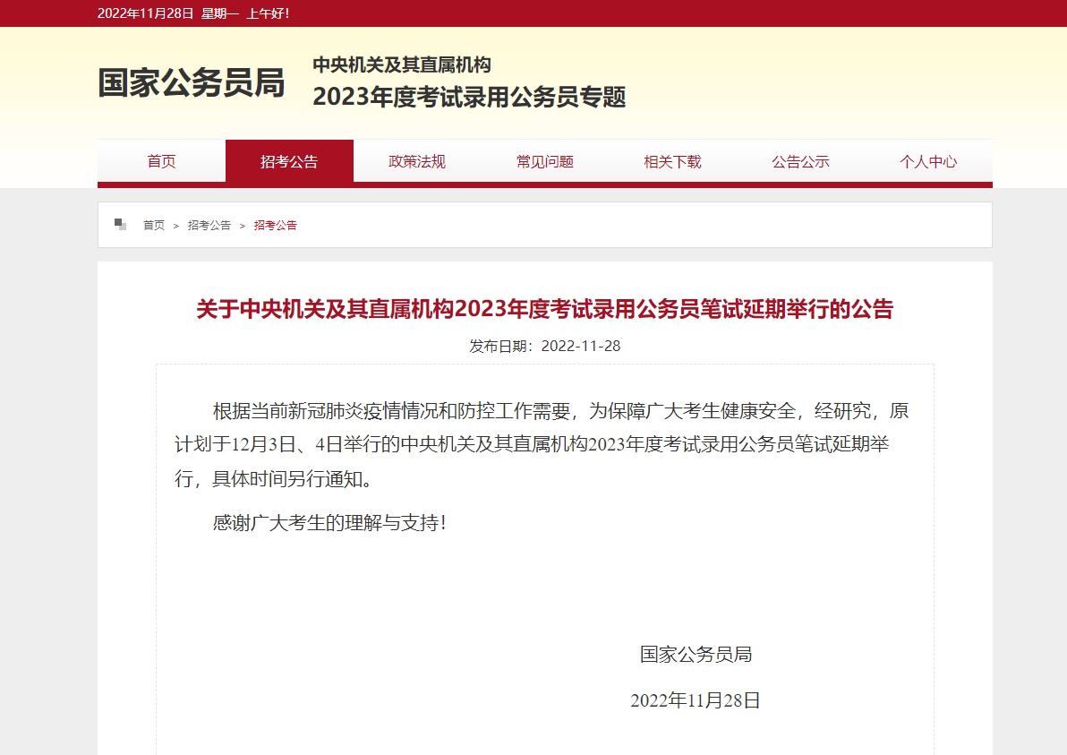 ??根據(jù)當(dāng)前新冠肺炎疫情情況和防控工作需要,為保障廣大考生健康安全,經(jīng)研究,原計(jì)劃于12月3日、4日舉行的中央機(jī)關(guān)及其直屬機(jī)構(gòu)2023年度考試錄用公務(wù)員筆試延期舉行,具體時(shí)間另行通知。