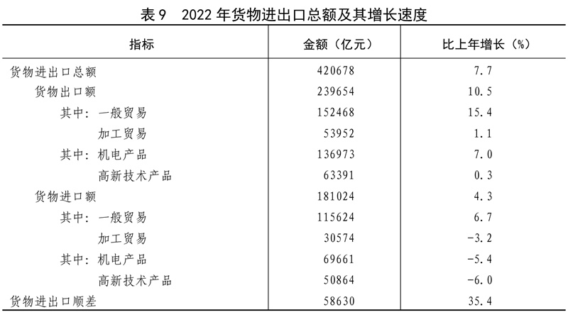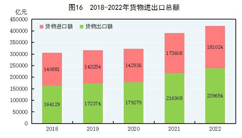 全年貨物進出口總額420678億元,比上年增長7.7%。其中,出口239654億元,增長10.5%;進口181024億元,增長4.3%。貨物進出口順差58630億元,比上年增加15330億元。對“一帶一路”[40]沿線國家進出口總額138339億元,比上年增長19.4%。其中,出口78877億元,增長20.0%;進口59461億元,增長18.7%。對《區(qū)域全面經(jīng)濟伙伴關系協(xié)定》(RCEP)其他成員國[41]進出口額129499億元,比上年增長7.5%。