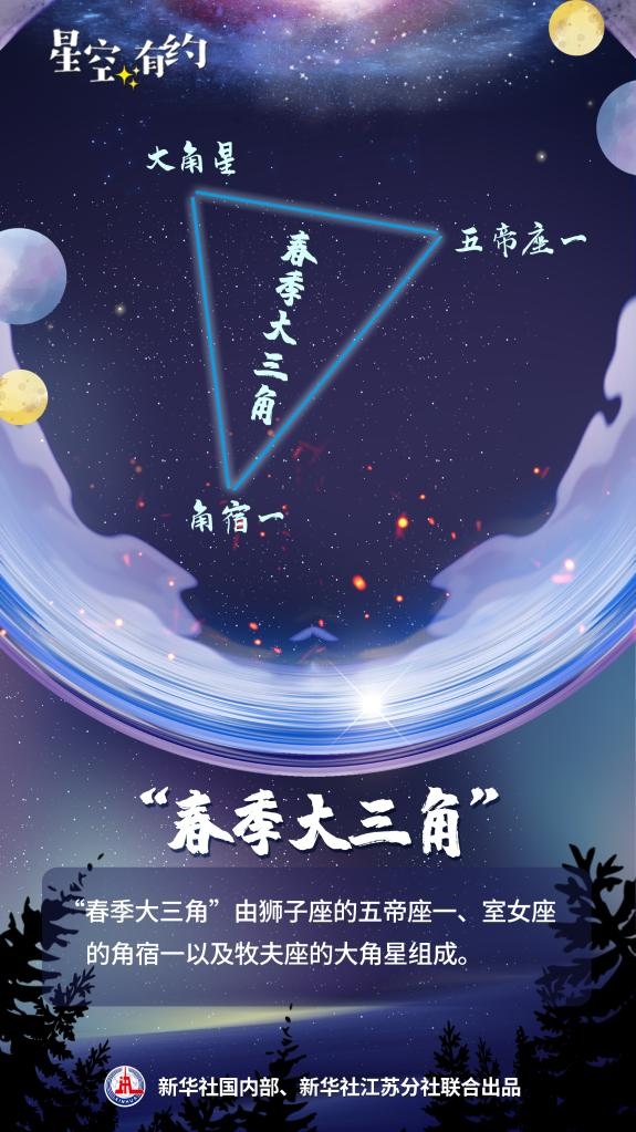 3月天黑后,“春季大三角”會(huì)從東方緩緩升起。其中,大角星是春夜星空的第一亮星,角宿一則是代表“二月二,龍?zhí)ь^”的一顆“龍頭星”。