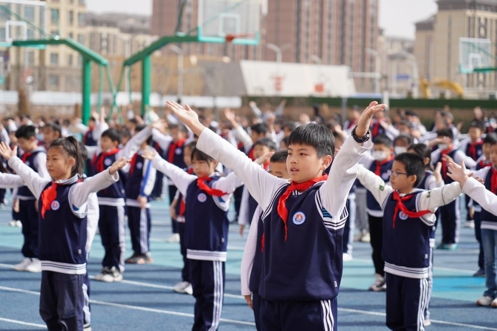 雄安新區(qū)容西片區(qū)云溪小學(xué)的學(xué)生在操場上做操(3月23日攝)。