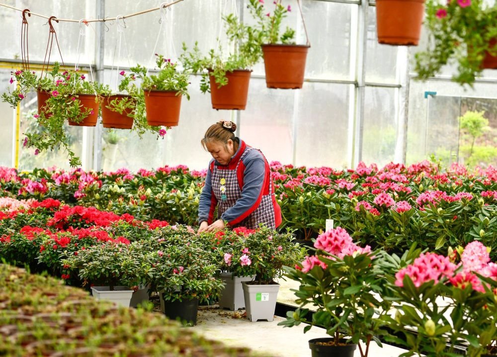農(nóng)民在貴州省畢節(jié)市百里杜鵑管理區(qū)匯境花卉基地管護花卉(2023年3月28日攝)。新華社記者 楊文斌 攝