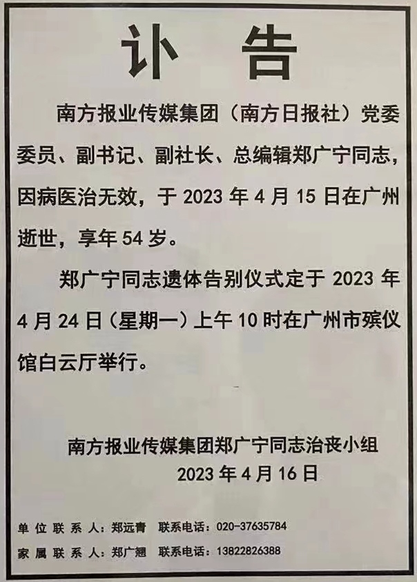 據(jù)南方報業(yè)傳媒集團(tuán)發(fā)布的訃告,南方報業(yè)傳媒集團(tuán)(南方日報社)黨委委員、副書記、副社長、總編輯鄭廣寧同志,因病醫(yī)治無效,于2023年4月15日在廣州逝世,享年54歲。