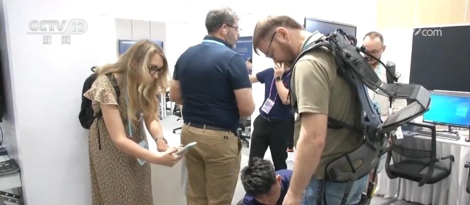 在新設的工業(yè)自動化及智能制造新展區(qū),一位在剛果(金)經(jīng)營礦場的采購商正在試穿一款外骨骼產(chǎn)品,這款智能設備可以幫助實現(xiàn)減輕30%到70%的負重。