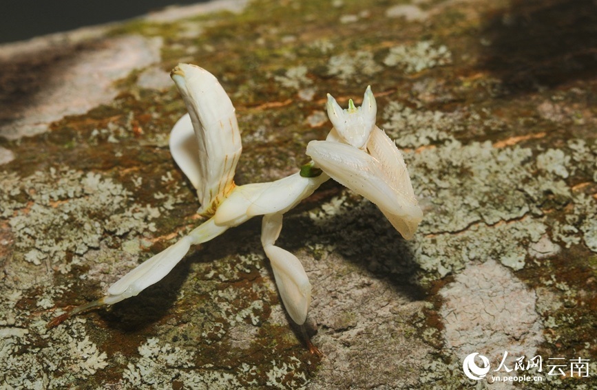 “這只螳螂周身潔白,帶有少量的綠色、棕色,頭部呈三角形,與常見(jiàn)螳螂細(xì)長(zhǎng)的足部不同的是,這只螳螂的足部寬扁似花瓣,行走起來(lái)或停留在林中時(shí),像極了盛開(kāi)的一朵鮮花?!睏顗?mèng)醒說(shuō)。
