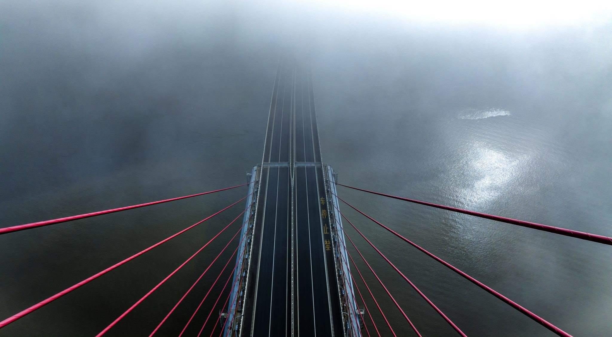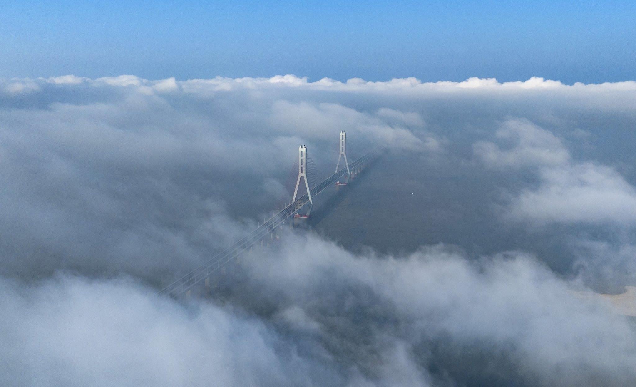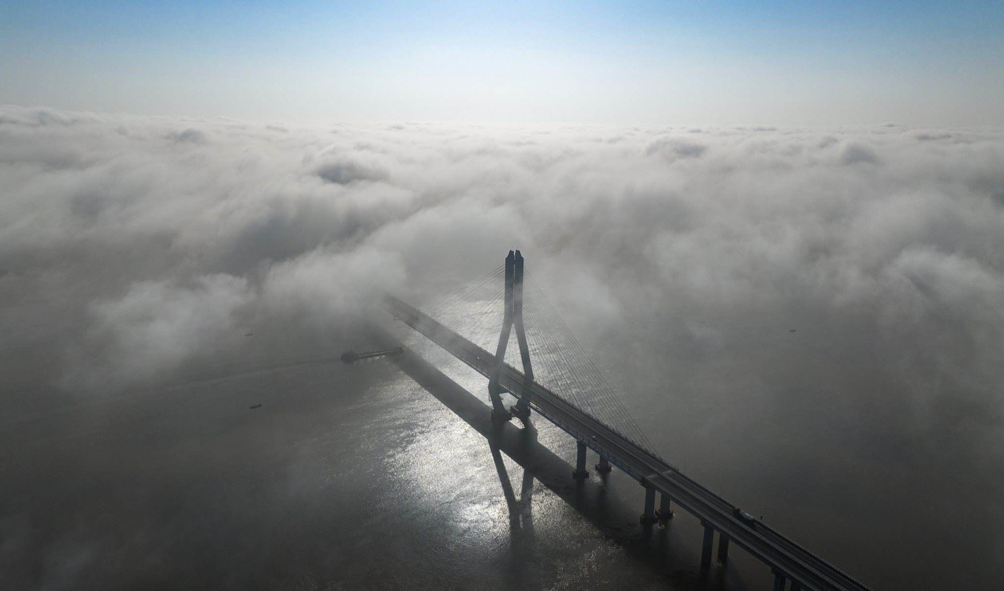 江西九江現(xiàn)平流霧景觀 鄱陽湖二橋若隱若現(xiàn)