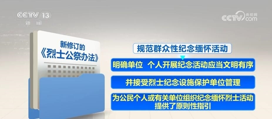 新修訂的《烈士公祭辦法》自5月1日起施行。其中,強(qiáng)調(diào)發(fā)揮公祭活動(dòng)對(duì)青少年的教育作用,要求各級(jí)各類學(xué)校組織學(xué)生以適當(dāng)方式參加烈士公祭,加強(qiáng)愛國(guó)主義、集體主義、社會(huì)主義教育。規(guī)范群眾性紀(jì)念緬懷活動(dòng),明確單位、個(gè)人開展紀(jì)念活動(dòng)應(yīng)當(dāng)文明有序,并接受烈士紀(jì)念設(shè)施保護(hù)單位管理,為公民個(gè)人或有關(guān)單位組織紀(jì)念緬懷烈士活動(dòng)提供了原則性指引。
